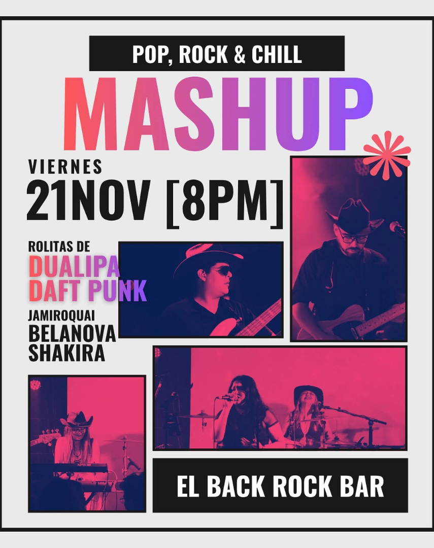 Disfruta de un viernes de Mashup, donde la banda que mezcla rolas que nunca pensaste escuchar juntas, terminan sonando de manera brutal. Paramore con Miley, Evanescence con Belanova y todo en una sola noche; una noche de rock, pop, nostalgia y fiesta pura te esperan.