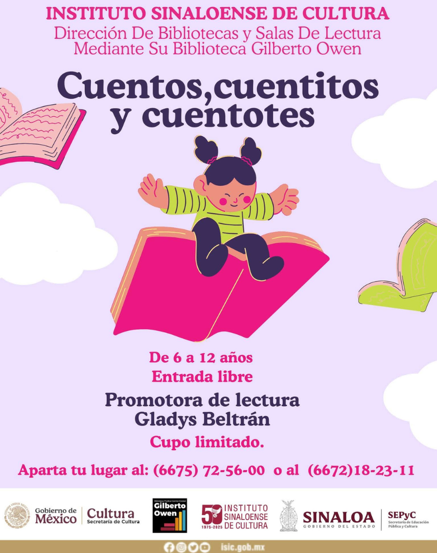 Lleva a tus niños a un curso de lectura, donde menores de 6 a 12 años tienen la oportunidad de aprender la cultura lectora en la Biblioteca de Gilberto Owen, con la promotora de lectura Gladys Beltrán.