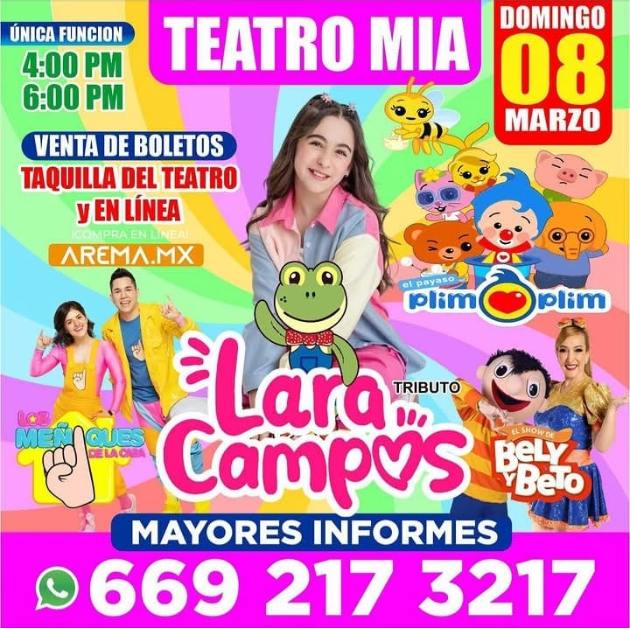 Disfruta de un espectáculo para toda la familia, lleno de diversión con Lara Campos, acompañada con grandes figuras infantiles como Plim Plim, Belly y Beto, y los Meñiques de la casa, no te lo pierdas.