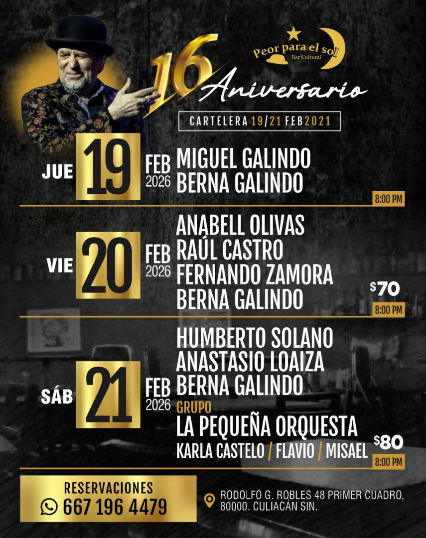 Prepárate para 3 noches de la cartelera tradicional de la música, contando con grandes solistas y grupos invitados bien conocidos de Peor para el sol, disfruta 3 noches llenas de entretenimiento y satisfacción de temas musicales diversos.